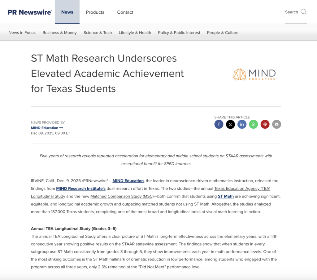 PR Newswire: ST Math Research Underscores Elevated Academic Achievement for Texas Students